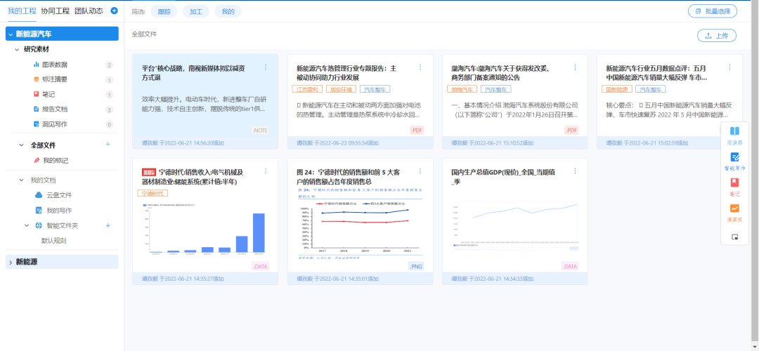 全能阅读,支持工作中各类文件的查看阅读,包括PDF、Word、PPT、Excel等文件,或者是产业链图谱和文本笔记等。利用图表OCR识别功能,对抽取后的图表数据可进行二次加工编辑以应用到具体的工作场景。同时基于NLP技术可自动将各类文件打标归档,并持续更新。
