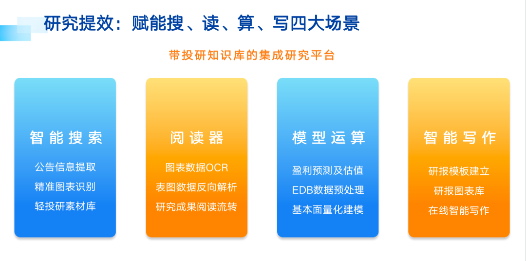 接着白雪介绍了轻量级工作台“WarrenQ”,它既是生产数字化的重要载体,也是快速数字化连通买方的系统基础。产品定位是“带投研知识库的集成研究平台”,通过“搜、读、算、写”四大场景给研究人员的工作提效。